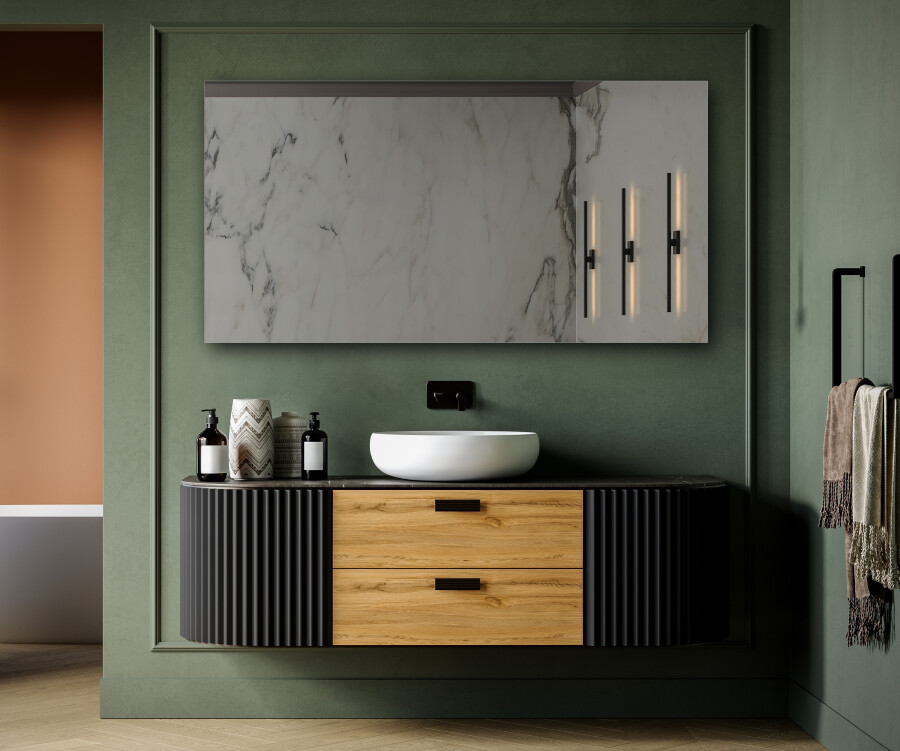 W zależności od tego, na jakim efekcie Ci zależy, możesz użyć jednej lub kilku listew, ułożonych w stosunku do siebie w równych odległościach, pośrodku nich osadź lustro. Jeżeli chcesz, aby dekoracja była bardzo widoczna, użyj szerokich listew o większej grubości. Lustra LED z panelem oświetleniowym, dostępne w ofercie Artformy pozwolą Ci dodatkowo podświetlić ścianę i stworzyć mocny element dekoracyjny.