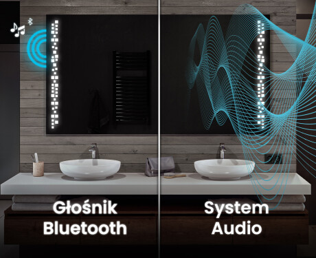 Lustro prostokątne z kwadratami LED nie służy jedynie do wykonywania makijażu czy układania fryzury. Ten model możesz zakupić z głośnikiem Bluetooth, aby móc słuchać ulubionych piosenek podczas codziennych czynności pielęgnacyjnych.